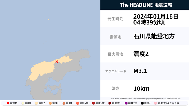 1月16日4時39分頃、石川県で最大震度2の地震を観測