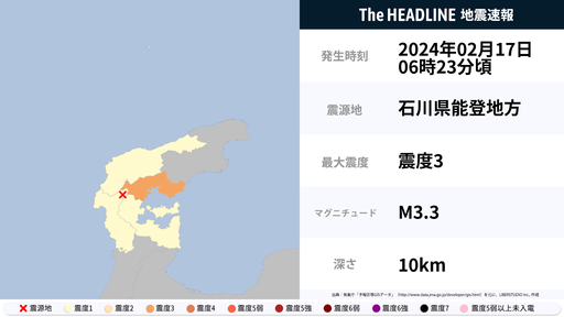 2月28日16時14分頃、石川県で最大震度3の地震を観測