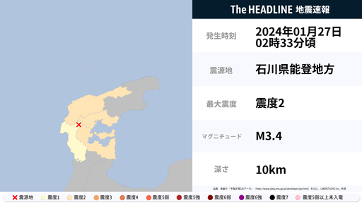 2月3日22時9分頃、石川県で最大震度2の地震を観測