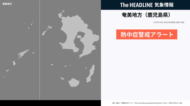 環境省と気象庁は、今日7月9日を対象とした熱中症警報アラートを鹿児島県(奄美地方)に対して発表しました。外出はなるべく避け、室内をエアコン等で涼しい環境にして過ごしてください。