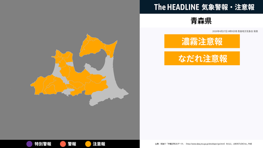 4月27日6時9分頃、青森県に濃霧注意報・なだれ注意報が発表
