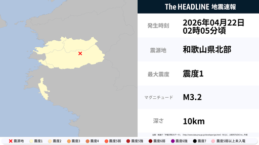 4月22日2時5分頃、和歌山県で最大震度1の地震を観測