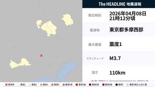4月8日20時13分頃、広島県・山口県などで最大震度1の地震を観測
