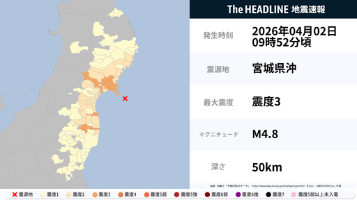 4月2日9時52分頃、宮城県・福島県で最大震度3の地震を観測