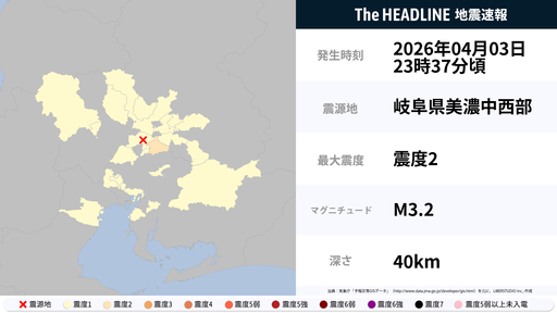 4月3日23時37分頃、愛知県で最大震度2の地震を観測