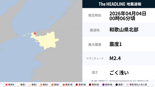 4月4日0時6分頃、和歌山県で最大震度1の地震を観測