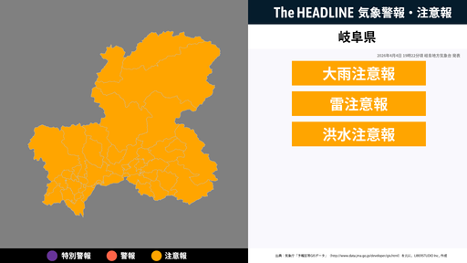 4月4日19時22分頃、岐阜県の大雨注意報・雷注意報などが更新
