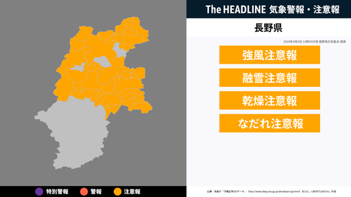 4月9日12時50分頃、長野県に強風注意報・融雪注意報などが発表
