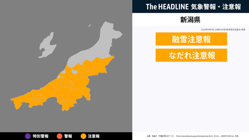 4月9日23時42分頃、新潟県に融雪注意報・なだれ注意報が発表
