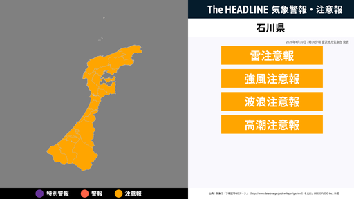 4月10日7時36分頃、石川県の雷注意報・強風注意報などが更新