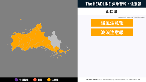 4月10日14時32分頃、山口県に強風注意報・波浪注意報が発表