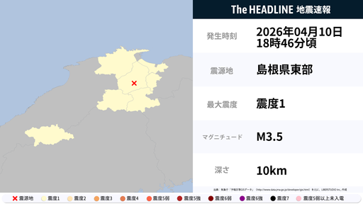 4月10日18時46分頃、鳥取県・島根県で最大震度1の地震を観測
