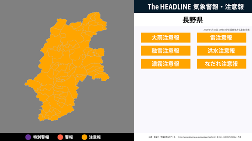 4月10日18時37分頃、長野県の大雨注意報・雷注意報などが更新