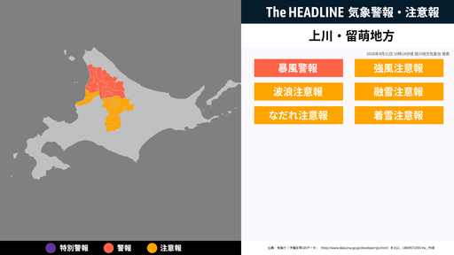 4月11日10時14分頃、上川地方・留萌地方の暴風警報・強風注意報などが更新