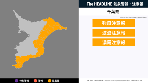 4月11日10時11分頃、千葉県の強風注意報・波浪注意報などが更新