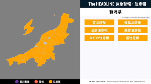 4月11日21時16分頃、新潟県の雷注意報・強風注意報などが更新