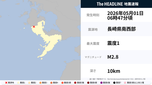 5月1日6時47分頃、長崎県で最大震度1の地震を観測