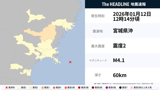 1月12日12時14分頃、岩手県で最大震度2の地震を観測