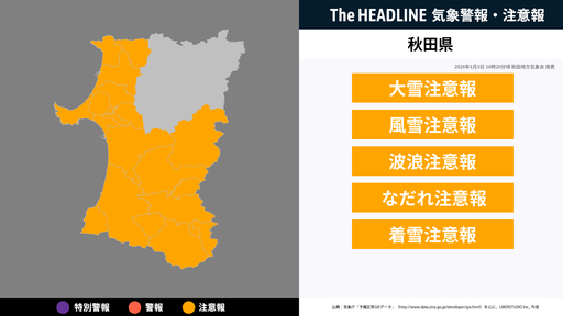 1月3日16時20分頃、秋田県に大雪注意報・風雪注意報などが発表