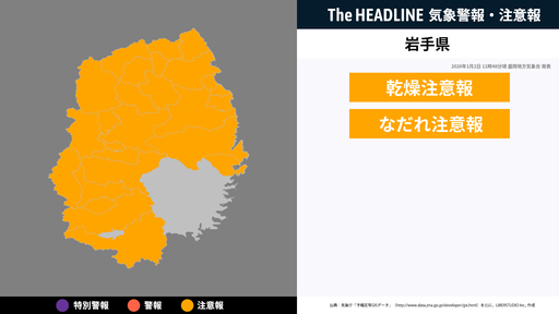 1月2日11時48分頃、岩手県に乾燥注意報・なだれ注意報が発表