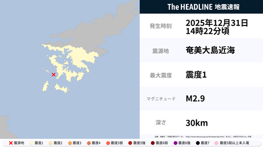12月31日14時22分頃、鹿児島県で最大震度1の地震を観測