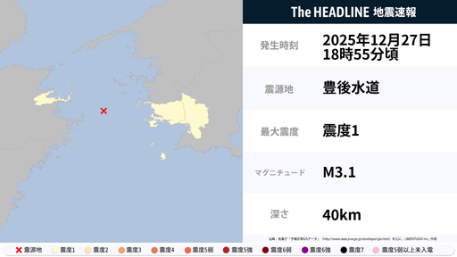 12月27日18時56分頃、愛媛県・高知県などで最大震度1の地震を観測