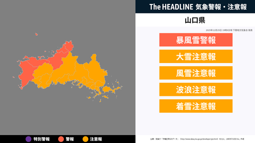 12月25日19時8分頃、山口県に暴風雪警報・大雪注意報などが発表