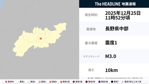 12月25日11時52分頃、長野県で最大震度1の地震を観測