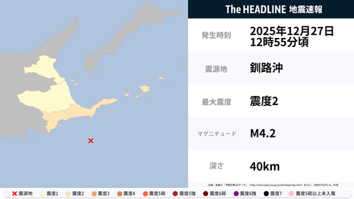 12月27日12時55分頃、北海道で最大震度2の地震を観測
