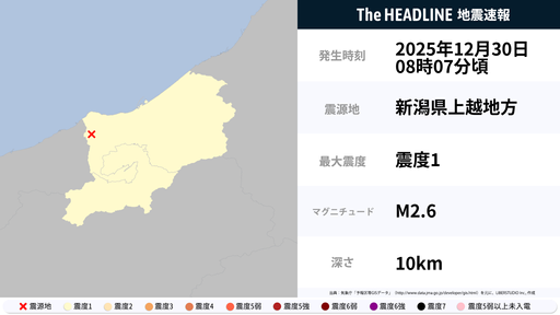 12月30日8時7分頃、新潟県で最大震度1の地震を観測