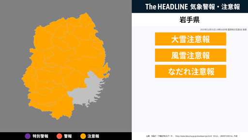 12月31日19時16分頃、岩手県に大雪注意報・風雪注意報などが発表