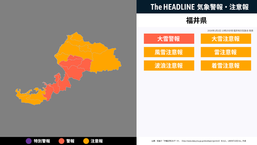 1月2日13時25分頃、福井県に大雪警報・大雪注意報などが発表
