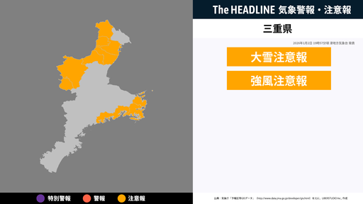 1月2日19時57分頃、三重県の大雪注意報・強風注意報が更新