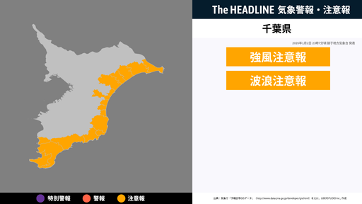 1月2日23時7分頃、千葉県に強風注意報・波浪注意報が発表