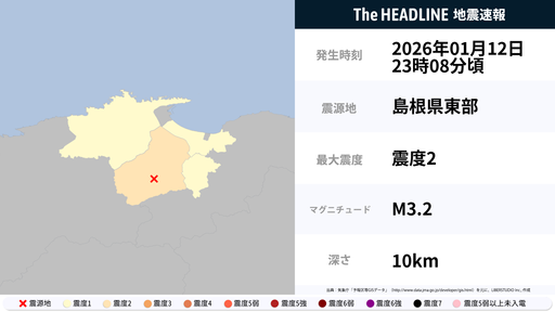 1月12日23時8分頃、島根県で最大震度2の地震を観測