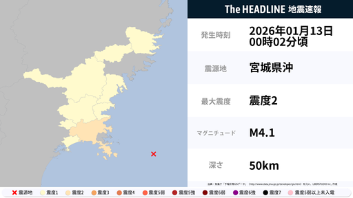 1月13日0時2分頃、宮城県で最大震度2の地震を観測