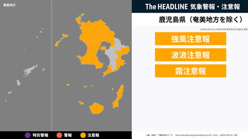 1月13日13時44分頃、鹿児島県(奄美地方除く)の強風注意報・波浪注意報などが更新