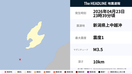 4月23日23時39分頃、新潟県で最大震度1の地震を観測