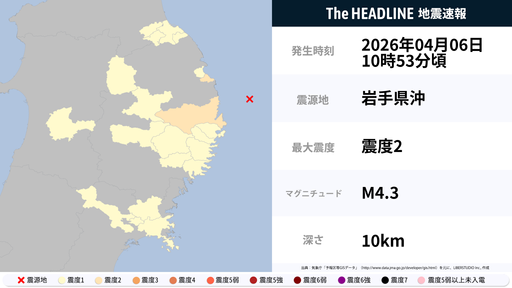 4月6日10時53分頃、岩手県で最大震度2の地震を観測