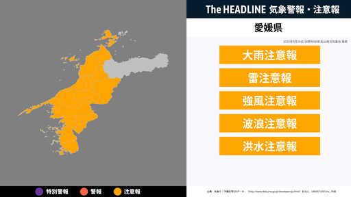 4月26日18時40分頃、愛媛県の大雨注意報・雷注意報などが更新