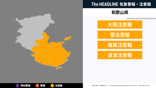 4月26日22時40分頃、和歌山県に大雨注意報・雷注意報などが発表