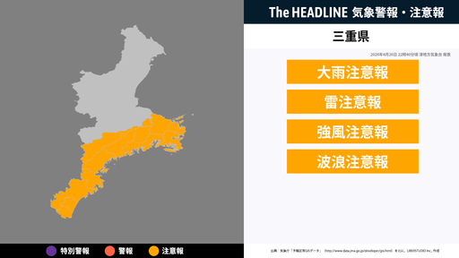 4月26日22時40分頃、三重県に大雨注意報・雷注意報などが発表