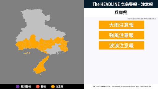 4月27日0時51分頃、兵庫県に大雨注意報・強風注意報などが発表
