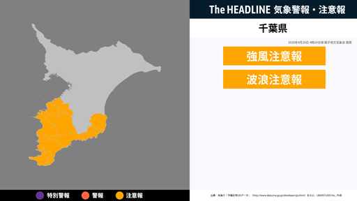 4月29日4時20分頃、千葉県の強風注意報・波浪注意報が更新