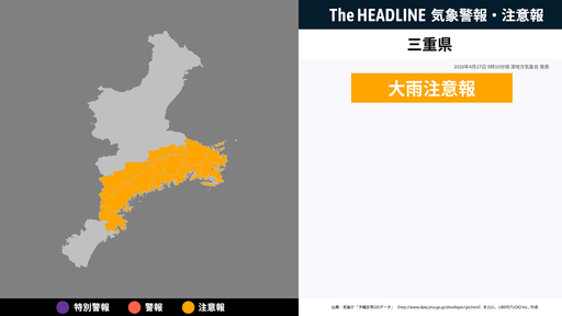 4月27日8時10分頃、三重県に大雨注意報が発表