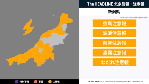 12月22日4時16分頃、新潟県の強風注意報・波浪注意報などが更新
