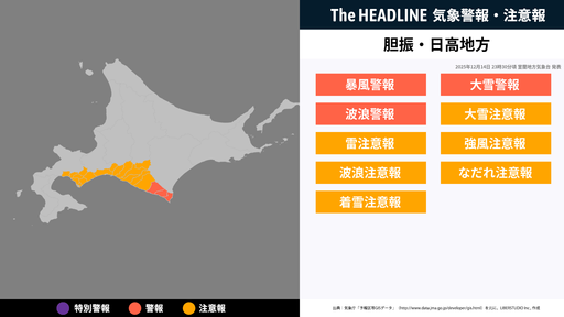 12月14日23時30分頃、胆振地方・日高地方に暴風警報・大雪警報などが発表