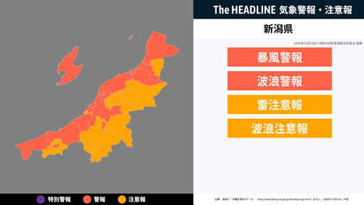 12月14日23時36分頃、新潟県の暴風警報・波浪警報などが更新