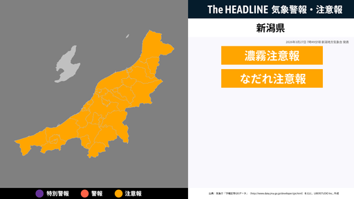3月27日7時49分頃、新潟県に濃霧注意報・なだれ注意報が発表