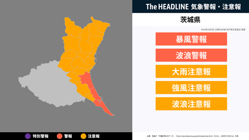 3月4日10時58分頃、茨城県の暴風警報・波浪警報などが更新